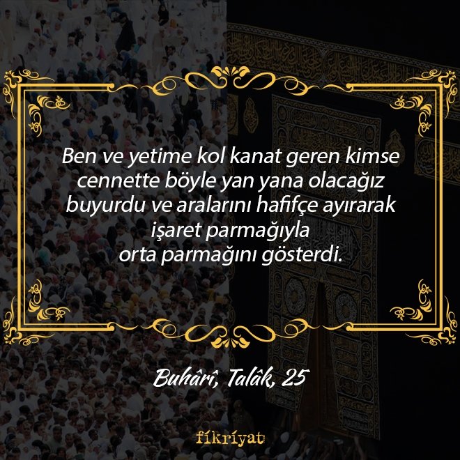 Sehl bin Sa'd'dan (RA) nakledildiğine göre Allah Rasulu (SAV): "Ben ve yetime kol kanat geren kimse cennette böyle yan yana olacağız buyurdu ve aralarını hafifçe ayırarak işaret parmağıyla orta parmağını gösterdi." (Buhârî, Talâk, 25)