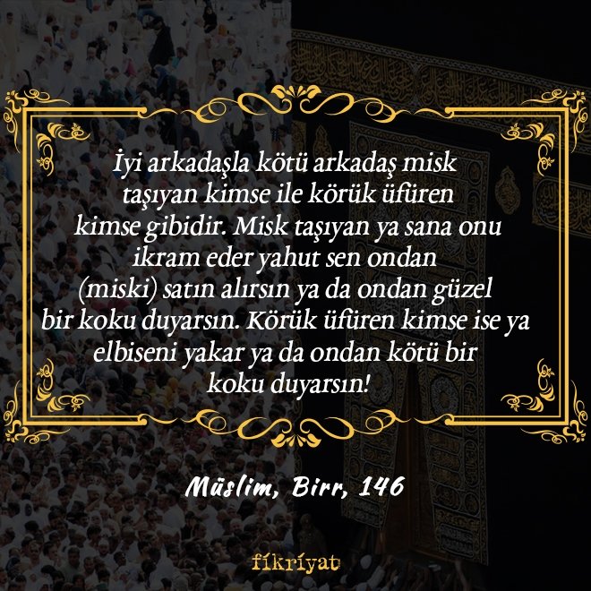 Ebu Musa el-Eş'ari'den nakledildiğine göre, Hz. Peygamber (SAV) şöyle buyurmuştur: "İyi arkadaşla kötü arkadaş misk taşıyan kimse ile körük üfüren kimse gibidir. Misk taşıyan ya sana onu ikram eder, yahut sen ondan (miski) satın alırsın ya da ondan güzel bir koku duyarsın. Körük üfüren kimse ise ya elbiseni yakar ya da ondan kötü bir koku duyarsın!" (Müslim, Birr, 146)