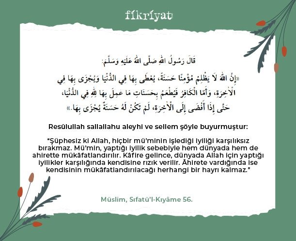 "Şüphesiz ki Allah, hiçbir mü'minin işlediği iyiliği karşılıksız bırakmaz. Mü'min, yaptığı iyilik sebebiyle hem dünyada hem de ahirette mükâfatlandırılır. Kâfire gelince, dünyada Allah için yaptığı iyilikler karşılığında kendisine rızık verilir. Âhirete vardığında ise kendisinin mükâfatlandırılacağı herhangi bir hayrı kalmaz."