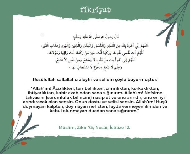 "Allah'ım! Âcizlikten, tembellikten, cimrilikten, korkaklıktan, ihtiyarlıktan, kabir azabından sana sığınırım. Allah'ım! Nefsime takvasını (sorumluluk bilincini) nasip et ve onu arındır; onu en iyi arındıracak olan sensin. Onun dostu ve velisi sensin. Allah'ım! Huşû duymayan kalpten, doymayan nefisten, fayda vermeyen ilimden ve kabul olunmayan duadan sana sığınırım."