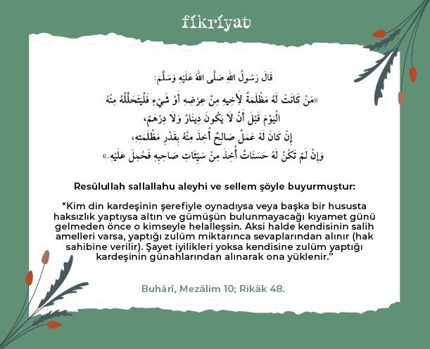 "Kim din kardeşinin şerefiyle oynadıysa veya başka bir hususta haksızlık yaptıysa altın ve gümüşün bulunmayacağı kıyamet günü gelmeden önce o kimseyle helalleşsin. Aksi halde kendisinin salih amelleri varsa, yaptığı zulüm miktarınca sevaplarından alınır (hak sahibine verilir). Şayet iyilikleri yoksa kendisine zulüm yaptığı kardeşinin günahlarından alınarak ona yüklenir."