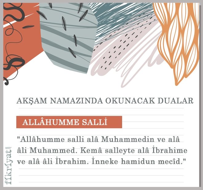 Okunuşu: "Allâhumme salli alâ Muhammedin ve alâ âli Muhammed. Kemâ salleyte alâ İbrahime ve alâ âli İbrahim. İnneke hamidun mecîd."