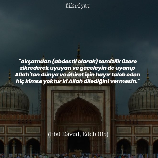 "Akşamdan (abdestli olarak) temizlik üzere zikrederek uyuyan ve geceleyin de uyanıp Allah'tan dünya ve âhiret için hayır taleb eden hiç kimse yoktur ki Allah dilediğini vermesin."