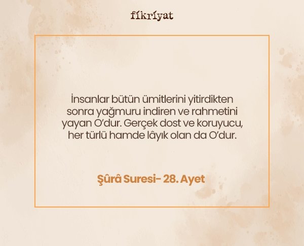➡ İnsanlar bütün ümitlerini yitirdikten sonra yağmuru indiren ve rahmetini yayan O'dur. Gerçek dost ve koruyucu, her türlü hamde lâyık olan da O'dur.