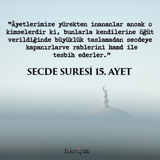 "Âyetlerimize yürekten inananlar ancak o kimselerdir ki, bunlarla kendilerine öğüt verildiğinde büyüklük taslamadan secdeye kapanırlar ve rablerini hamd ile tesbih ederler."