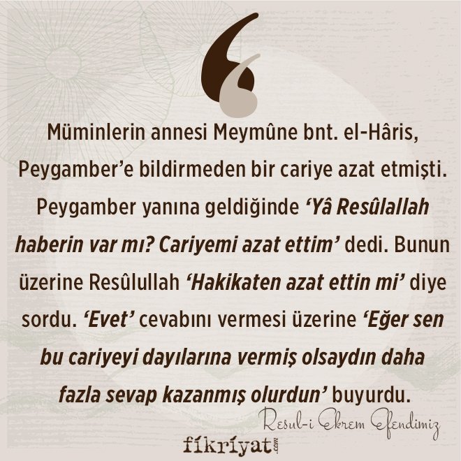 Müminlerin annesi Meymûne bnt. el-Hâris'ten (ra) rivayet edildiğine göre o, Peygamber'e bildirmeden bir cariye azat etmişti. Peygamber yanına geldiğinde "Yâ Resûlallah haberin var mı? Cariyemi azat ettim" dedi. Bunun üzerine Resûlullah "Hakikaten azat ettin mi" diye sordu. "Evet" cevabını vermesi üzerine "Eğer sen bu cariyeyi dayılarına vermiş olsaydın daha fazla sevap kazanmış olurdun" buyurdu.