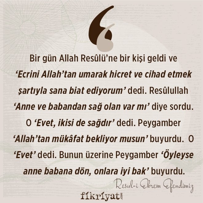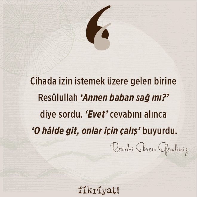 Cihada izin istemek üzere gelen birine Resûlullah "Annen baban sağ mı?" diye sordu. "Evet" cevabını alınca "O hâlde git, onlar için çalış" buyurdu.