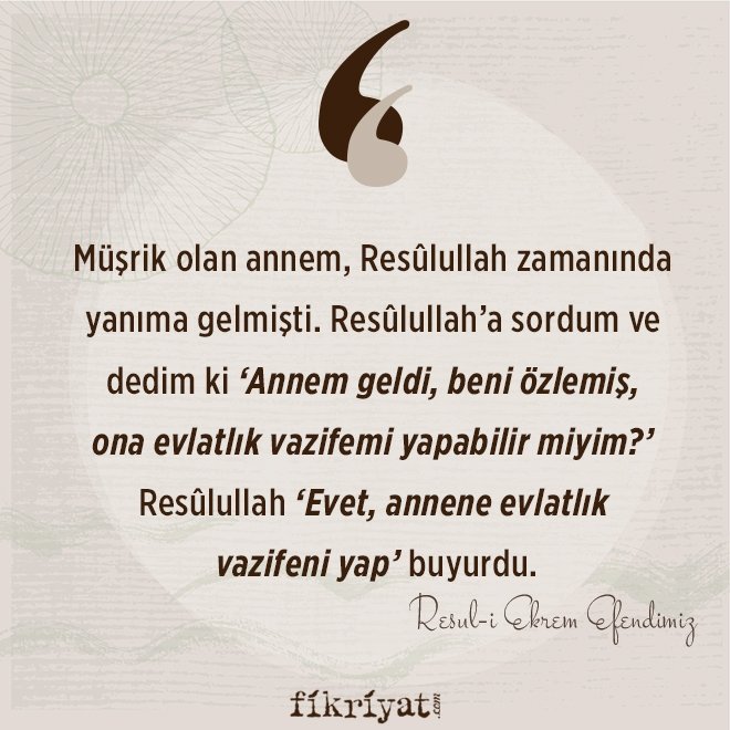 Müşrik olan annem, Resûlullah zamanında yanıma gelmişti. Resûlullah'a sordum ve dedim ki "Annem geldi, beni özlemiş, ona evlatlık vazifemi yapabilir miyim?" Resûlullah "Evet, annene evlatlık vazifeni yap" buyurdu.