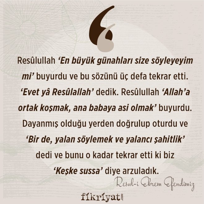Resûlullah "En büyük günahları size söyleyeyim mi" buyurdu ve bu sözünü üç defa tekrar etti. "Evet yâ Resûlallah" dedik. Resûlullah "Allah'a ortak koşmak, ana babaya asi olmak" buyurdu. Dayanmış olduğu yerden doğrulup oturdu ve "Bir de, yalan söylemek ve yalancı şahitlik" dedi ve bunu o kadar tekrar etti ki biz "Keşke sussa"diye arzuladık.