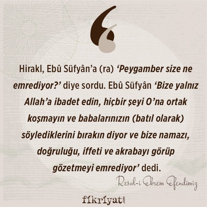 Ebû Süfyân Sahr b. Harb'den (ra) rivayet edilen Hirakl kıssasına dair uzun bir hadise göre Hirakl, Ebû Süfyân'a (ra) "Peygamber size ne emrediyor?" diye sordu. Ebû Süfyân "Bize yalnız Allah'a ibadet edin, hiçbir şeyi O'na ortak koşmayın ve babalarınızın (batıl olarak) söylediklerini bırakın diyor ve bize namazı, doğruluğu, iffeti ve akrabayı görüp gözetmeyi emrediyor" dedi.