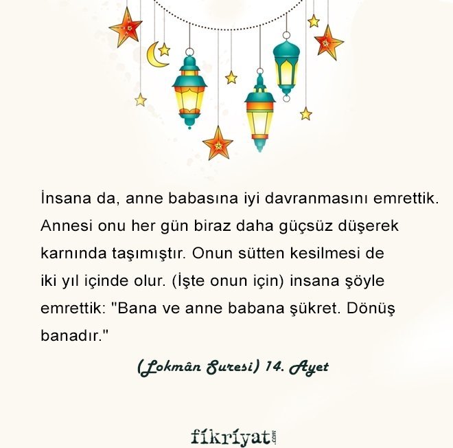 "İnsana da, anne babasına iyi davranmasını emrettik. Annesi onu her gün biraz daha güçsüz düşerek karnında taşımıştır. Onun sütten kesilmesi de iki yıl içinde olur. (İşte onun için) insana şöyle emrettik: "Bana ve anne babana şükret. Dönüş banadır."