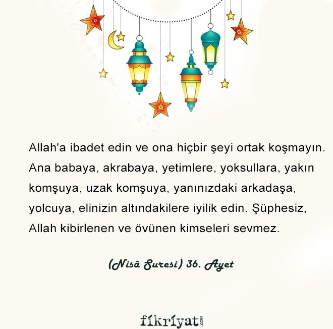 "Allah'a ibadet edin ve ona hiçbir şeyi ortak koşmayın. Ana babaya, akrabaya, yetimlere, yoksullara, yakın komşuya, uzak komşuya, yanınızdaki arkadaşa, yolcuya, elinizin altındakilere iyilik edin. Şüphesiz, Allah kibirlenen ve övünen kimseleri sevmez."
