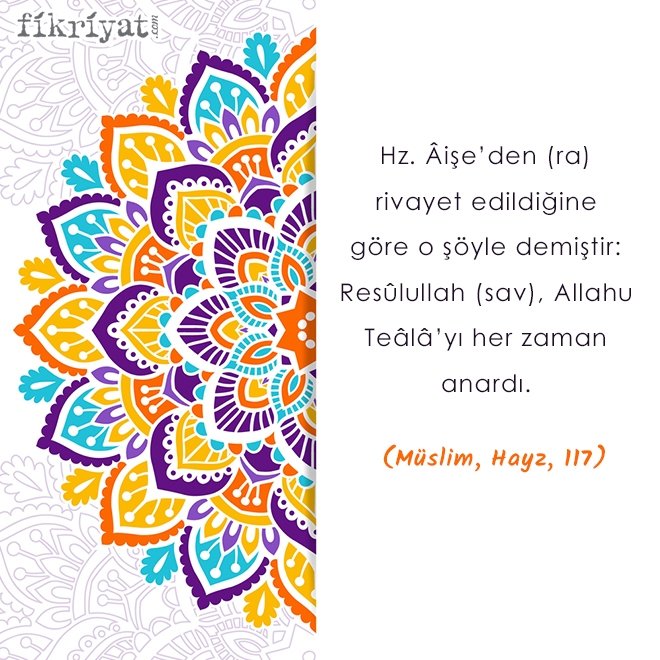 Müslümanlar yaşamın her anında Allah'ı hatırında tutarak, kulluğunun bilincinde olmalıdır. Müminin Rabbini anması kalbin gıdası ve kurtuluş vesilesidir. Nitekim ayet-i kerimede de "Bilesiniz ki gönüller ancak Allah'ı zikrederek huzura kavuşur" buyrulmaktadır. Peygamber Efendimiz, otururken, uyurken, konuşurken, bir işe başladığında kısacası her zaman Rabbini anardı. Sizler için Allah'ı her durumda anmanın önemini belirten ayet ve hadisleri derledik.