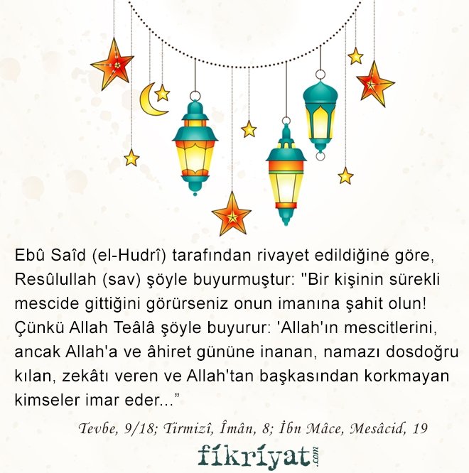 Ebû Saîd (el-Hudrî) tarafından rivayet edildiğine göre, Resûlullah (sav) şöyle buyurmuştur: "Bir kişinin sürekli mescide gittiğini görürseniz onun imanına şahit olun! Çünkü Allah Teâlâ şöyle buyurur: 'Allah'ın mescitlerini, ancak Allah'a ve âhiret gününe inanan, namazı dosdoğru kılan, zekâtı veren ve Allah'tan başkasından korkmayan kimseler imar eder..."