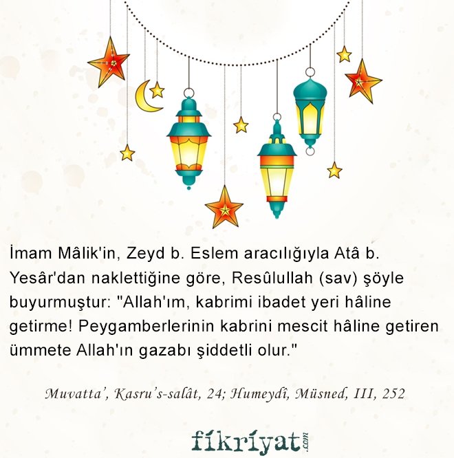 İmam Mâlik'in, Zeyd b. Eslem aracılığıyla Atâ b. Yesâr'dan naklettiğine göre, Resûlullah (sav) şöyle buyurmuştur: "Allah'ım, kabrimi ibadet yeri hâline getirme! Peygamberlerinin kabrini mescit hâline getiren ümmete Allah'ın gazabı şiddetli olur."