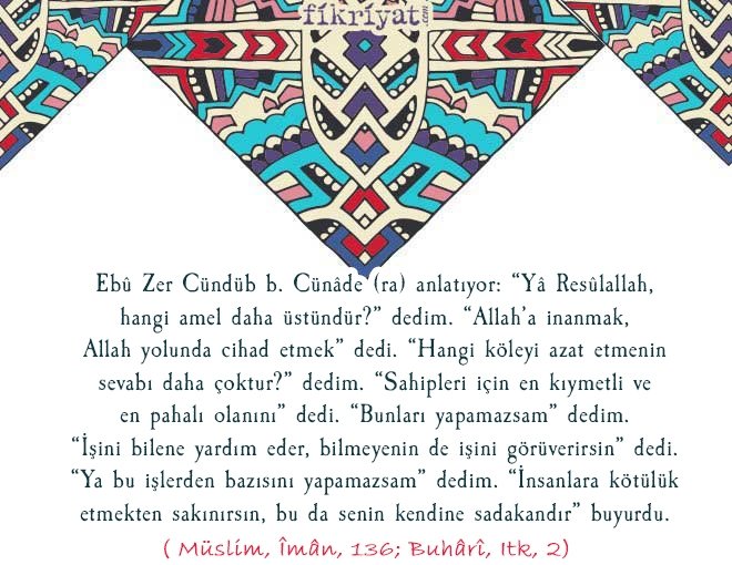 Ebû Zer Cündüb b. Cünâde (ra) anlatıyor: "Yâ Resûlallah, hangi amel daha üstündür?" dedim. "Allah'a inanmak, Allah yolunda cihad etmek" dedi. "Hangi köleyi azat etmenin sevabı daha çoktur?" dedim. "Sahipleri için en kıymetli ve en pahalı olanını" dedi. "Bunları yapamazsam" dedim. "İşini bilene yardım eder, bilmeyenin de işini görüverirsin" dedi. "Ya bu işlerden bazısını yapamazsam?" dedim. "İnsanlara kötülük etmekten sakınırsın, bu da senin kendine sadakandır" buyurdu.