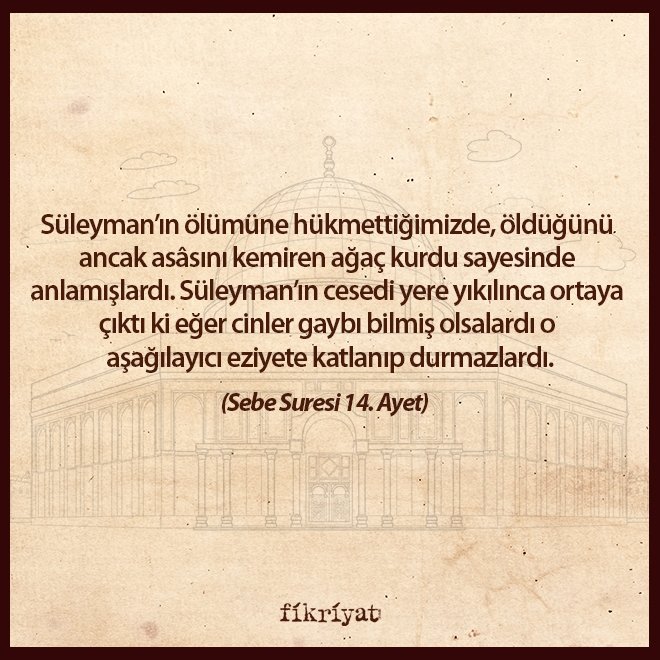 "Süleyman'ın ölümüne hükmettiğimizde, öldüğünü ancak asâsını kemiren ağaç kurdu sayesinde anlamışlardı. Süleyman'ın cesedi yere yıkılınca ortaya çıktı ki, eğer cinler gaybı bilmiş olsalardı o aşağılayıcı eziyete katlanıp durmazlardı."