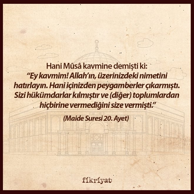 "Hani Mûsâ kavmine demişti ki: "Ey kavmim! Allah'ın, üzerinizdeki nimetini hatırlayın. Hani içinizden peygamberler çıkarmıştı. Sizi hükümdarlar kılmıştır ve (diğer) toplumlardan hiçbirine vermediğini size vermişti."