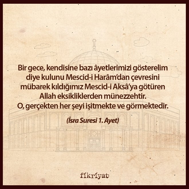 "Bir gece, kendisine bazı âyetlerimizi gösterelim diye kulunu Mescid-i Harâm'dan çevresini mübarek kıldığımız Mescid-i Aksâ'ya götüren Allah eksikliklerden münezzehtir. O, gerçekten her şeyi işitmekte ve görmektedir."
