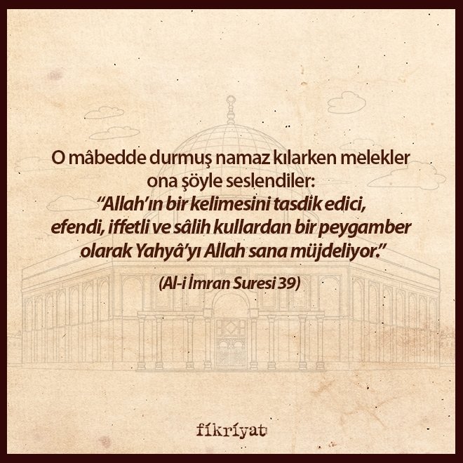 "O mâbedde durmuş namaz kılarken melekler ona şöyle seslendiler: "Allah'ın bir kelimesini tasdik edici, efendi, iffetli ve sâlih kullardan bir peygamber olarak Yahyâ'yı Allah sana müjdeliyor."