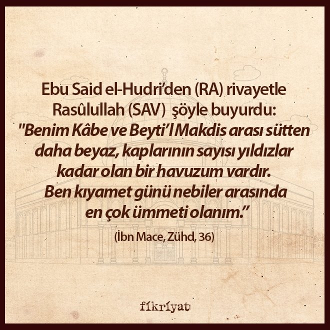 "Benim Kâbe ve Beyti'l Makdis arası sütten daha beyaz, kaplarının sayısı yıldızlar kadar olan bir havuzum vardır. Ben kıyamet günü nebiler arasında en çok ümmeti olanım."