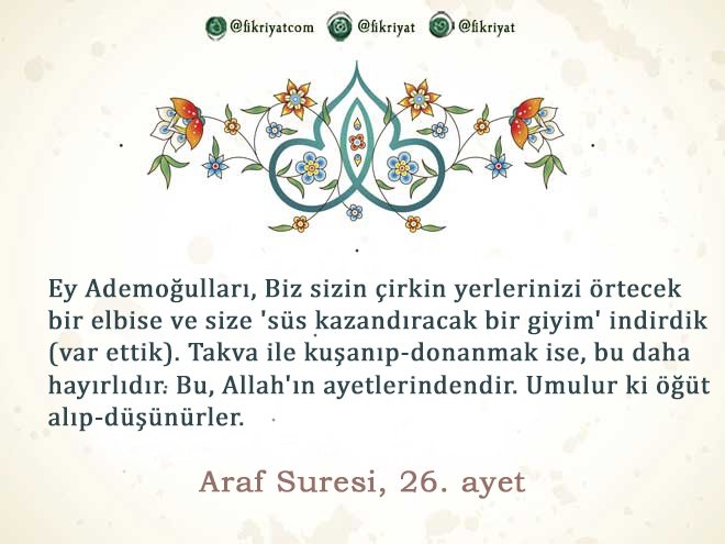 Ey Ademoğulları, Biz sizin çirkin yerlerinizi örtecek bir elbise ve size 'süs kazandıracak bir giyim' indirdik (var ettik). Takva ile kuşanıp-donanmak ise, bu daha hayırlıdır. Bu, Allah'ın ayetlerindendir. Umulur ki öğüt alıp-düşünürler.