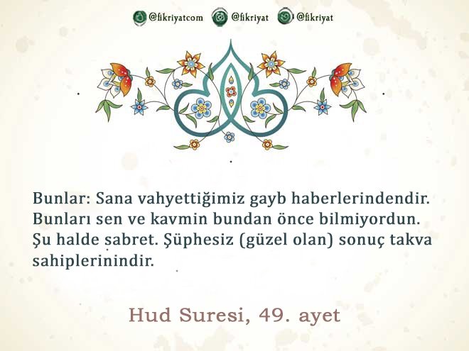 Bunlar: Sana vahyettiğimiz gayb haberlerindendir. Bunları sen ve kavmin bundan önce bilmiyordun. Şu halde sabret. Şüphesiz (güzel olan) sonuç takva sahiplerinindir.