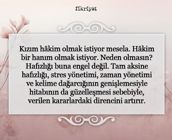 Muharrem Cirit: Şimdi, benim kendi yapamadıklarım, başaramadıklarımın kızımın başarması gibi bir isteğim yok. Az önce söylediğim gibi… Her insanın bir kabiliyeti var. İnsanlar kabiliyetleri nazarınca hareket etmeliler. Şimdi ben çocuğumun çocukluğunda, bir baba olarak, küçükken karakterim, kabiliyetlerim analiz edilseydi daha farklı olabilirdi. Bilemiyorum ama tabii buradaysak, eğer Allah'ın bize tayin ettiği zaman, mekân, durum en güzelidir. Bunu hiç kendi içimde irdelemem. Çünkü Efendimiz Aleyhissalatu Vesselam'ın bulunduğu sokağın taşının üzerinde olup, muhafaza Ebu Cehil'in yanında olmak da olabilirdi. O nedenle hamd ederim Allah'a ki, İslam coğrafyasında büyümüşüz. Ama benim kızımdan beklentilerim ya da oğlumdan beklentilerim, benim başaramadıklarım değil. Onların kendi iç dünyalarında başarmak istediklerine yardımcı olmak. Kızım hâkim olmak istiyor mesela. Hâkim bir hanım olmak istiyor. Neden olmasın? Hafızlığı buna engel değil. Tam aksine hafızlığı, stres yönetimi, zaman yönetimi ve kelime dağarcığının genişlemesiyle hitabının da güzelleşmesi sebebiyle, verilen kararlardaki direncini artırır. Çünkü bizim okuduğumuz, az önce söylediğim gibi, Kitab-ı Kerim'de en güzel motivasyonu, en güzel bilgiyi, en güzel isabeti bulabilirsiniz. Okuyacağı bölüm, hakimelik inşallah nasip olur. Orada da kendi inandığı değerler ışığında, adalete en yakın şekilde durabilecekse, ona da varım. Ama yoksa bizim baskımızla yapılacak bir şey değil. Çünkü bu gerçekten karar vermekle alakalı.