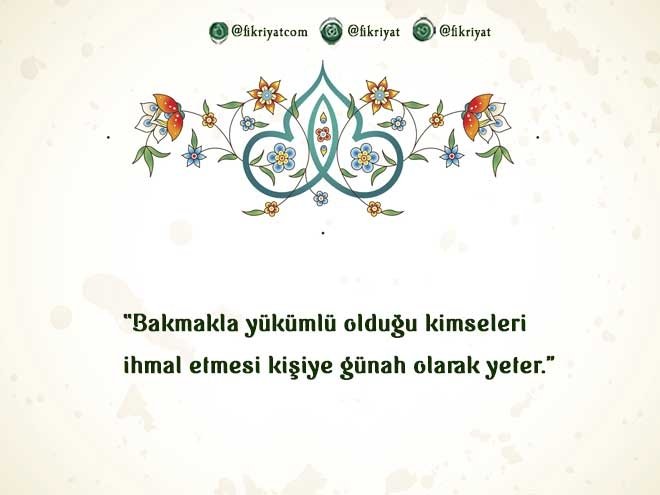 Peygamber Efendimizin bir hadisine göre, "Bakmakla yükümlü olduğu kimseleri ihmal etmesi kişiye günah olarak yeter." Ebû Davûd, Zekât, 45