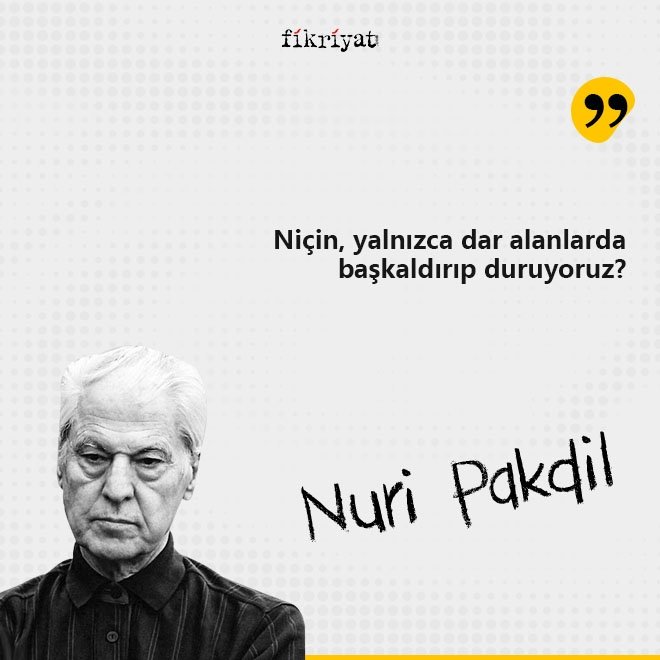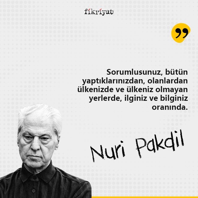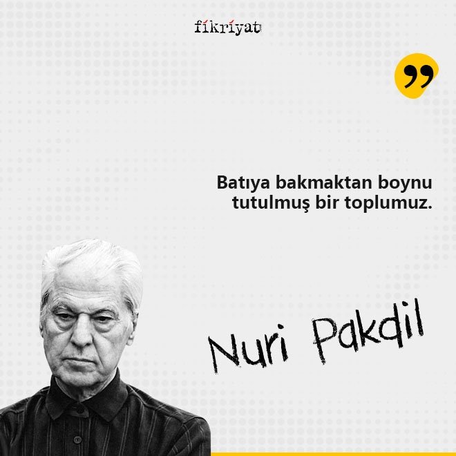 Asil duruşu ile edebiyat ve fikir dünyamızın vazgeçilmez isimlerinden olan Nuri Pakdil, cümleleri evrensel mesajlar olarak görürdü. Yazıları ve şiirleri ile milletimize ümmet çağrısını müjdeleyen büyük usta, adeta yirminci yüzyıldan çağlara seslendi. Sizler için Nuri Pakdil'in birbirinden etkileyici cümlelerini bir araya getirdik.