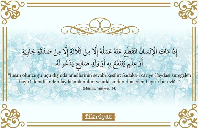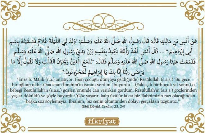 "Enes b. Malik (r.a.) anlatıyor: (Son çocuğu dünyaya geldiğinde) Resülullah (s.a.s.) 'Bu gece bir oğlum oldu. Ona atam İbrahim'in ismini verdim.' buyurdu ... (Yaklaşık bir buçuk yıl sonra) o bebeği Resülullah'm (s.a.s.) gözleri önünde can verirken gördüm. Resülullah'm (s.a.s.) gözlerinden yaşlar döküldü ve şöyle buyurdu: 'Göz yaşam, kalp üzülür fakat biz Rabbimizin razı olacağından başka söz söylemeyiz. İbrahim, biz senin ölümünden dolayı gerçekten üzgünüz.'"