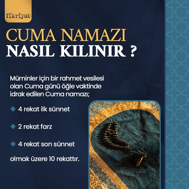 ◾ Müminler için bir rahmet vesilesi olan Cuma günü öğle vaktinde idrak edilen Cuma namazı; 4 rekat ilk sünnet, 2 rekat farz, 4 rekat son sünnet olmak üzere 10 rekattır.