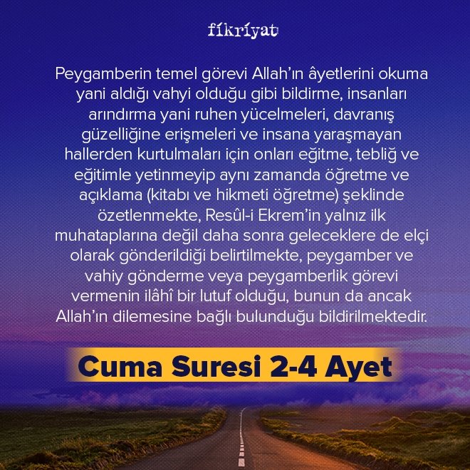 ◼ Peygamberin temel görevi Allah'ın âyetlerini okuma yani aldığı vahyi olduğu gibi bildirme, insanları arındırma yani ruhen yücelmeleri, davranış güzelliğine erişmeleri ve insana yaraşmayan hallerden kurtulmaları için onları eğitme, tebliğ ve eğitimle yetinmeyip aynı zamanda öğretme ve açıklama (kitabı ve hikmeti öğretme) şeklinde özetlenmekte, Resûl-i Ekrem'in yalnız ilk muhataplarına değil daha sonra geleceklere de elçi olarak gönderildiği belirtilmekte, peygamber ve vahiy gönderme veya peygamberlik görevi vermenin ilâhî bir lutuf olduğu, bunun da ancak Allah'ın dilemesine bağlı bulunduğu bildirilmektedir.