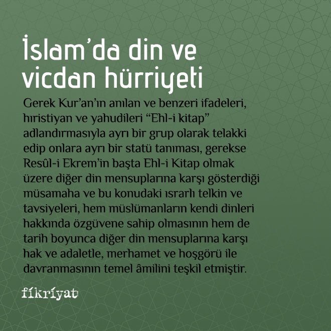◾ Gerek Kur'an'ın anılan ve benzeri ifadeleri, hıristiyan ve yahudileri "Ehl-i kitap" adlandırmasıyla ayrı bir grup olarak telakki edip onlara ayrı bir statü tanıması, gerekse Resûl-i Ekrem'in başta Ehl-i Kitap olmak üzere diğer din mensuplarına karşı gösterdiği müsamaha ve bu konudaki ısrarlı telkin ve tavsiyeleri, hem müslümanların kendi dinleri hakkında özgüvene sahip olmasının hem de tarih boyunca diğer din mensuplarına karşı hak ve adaletle, merhamet ve hoşgörü ile davranmasının temel âmilini teşkil etmiştir.