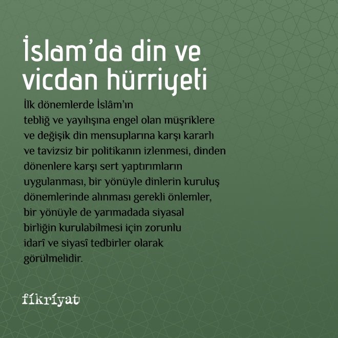 ◾ İlk halife Ebû Bekir'in dinden dönenler ve devlete vergi ödemeyerek baş kaldıranlara karşı savaşması, Arap yarımadasındaki müşrik Araplar'ın müslüman olmaya veya yarımada dışında zorla iskâna tâbi tutulması insanlara din ve vicdan hürriyeti tanınmadığı şeklinde değil de, o dönemde irtidad hareketinin siyasal isyana ve kamu düzeni ihlâline dönüşmüş olmasıyla ve yeni kurulan siyasal birliğin korunması zaruretiyle açıklanmalıdır.