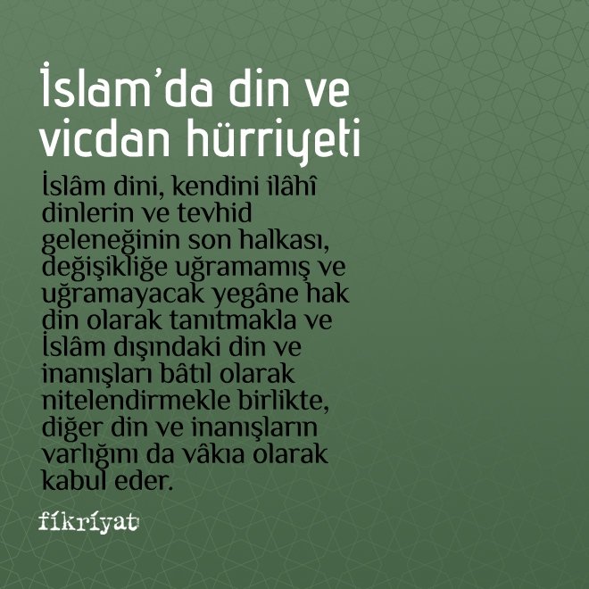 ◾ İslâm'ın "cihad" ilke ve emri de din ve vicdan hürriyetini tanımayan ve kısıtlayan bir prensip veya İslâmiyet'i zor kullanarak benimsetme ameliyesi değil, Tanrı'nın birliğini ifade eden kelime-i tevhîdi yayma, dinin varlığının kabul edilmesini ve yayılmasını engelleyen şartların ortadan kaldırılması çabasıdır.
