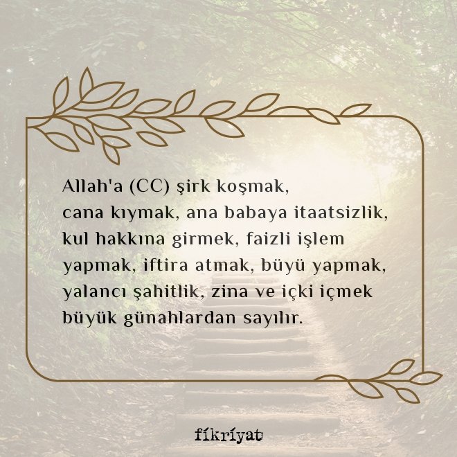 🔸 Allah'a (CC) şirk koşmak, cana kıymak, ana babaya itaatsizlik, kul hakkına girmek, faizli işlem yapmak, iftira atmak, büyü yapmak, yalancı şahitlik, zina ve içki içmek büyük günahlardan sayılır.