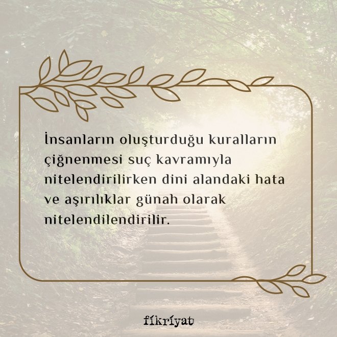 🔸 İnsanların kuralları çiğnemesi suç kavramıyla nitelendirilirken dini alandaki hata ve aşırılıklar günah olarak adlandırılır.