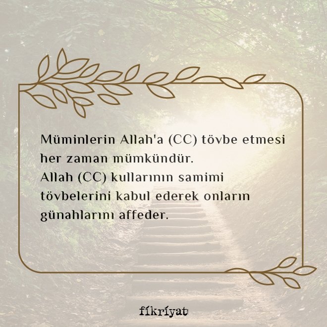 🔸 Müminlerin Allah'a (CC) tövbe etmesi her zaman mümkündür. Cenab-ı Hakk (CC) kullarının samimi tövbelerini kabul ederek onların günahlarını affeder.