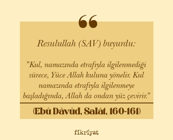 "Kul, namazında etrafıyla ilgilenmediği sürece, Yüce Allah kuluna yönelir. Kul namazında etrafıyla ilgilenmeye başladığında, Allah da ondan yüz çevirir."