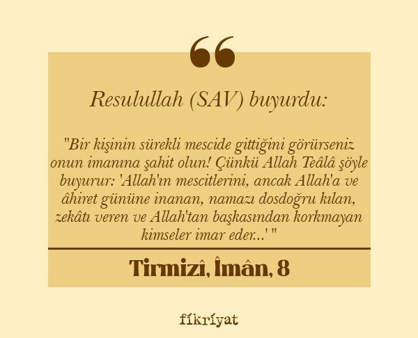 "Bir kişinin sürekli mescide gittiğini görürseniz onun imanına şahit olun! Çünkü Allah Teâlâ şöyle buyurur: 'Allah'ın mescitlerini, ancak Allah'a ve âhiret gününe inanan, namazı dosdoğru kılan, zekâtı veren ve Allah'tan başkasından korkmayan kimseler imar eder...' "