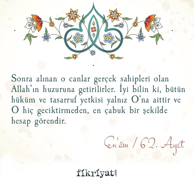 "Sonra alınan o canlar gerçek sahipleri olan Allah'ın huzuruna getirilirler. İyi bilin ki, bütün hüküm ve tasarruf yetkisi yalnız O'na aittir ve O hiç geciktirmeden, en çabuk bir şekilde hesap görendir." En'âm / 62. Ayet