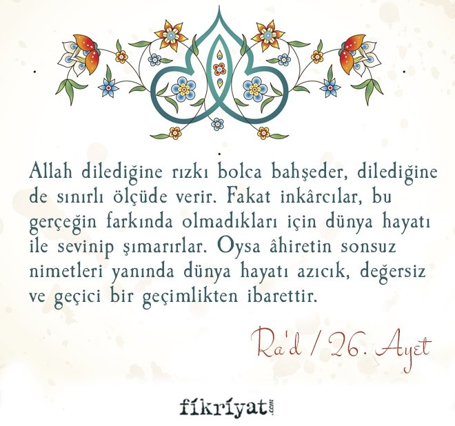 "Allah dilediğine rızkı bolca bahşeder, dilediğine de sınırlı ölçüde verir. Fakat inkârcılar, bu gerçeğin farkında olmadıkları için dünya hayatı ile sevinip şımarırlar. Oysa âhiretin sonsuz nimetleri yanında dünya hayatı azıcık, değersiz ve geçici bir geçimlikten ibarettir." Ra'd / 26. Ayet