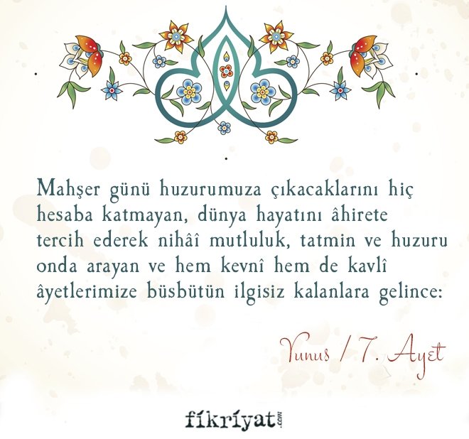 "Mahşer günü huzurumuza çıkacaklarını hiç hesaba katmayan, dünya hayatını âhirete tercih ederek nihâî mutluluk, tatmin ve huzuru onda arayan ve hem kevnî hem de kavlî âyetlerimize büsbütün ilgisiz kalanlara gelince:" Yunus / 7. Ayet