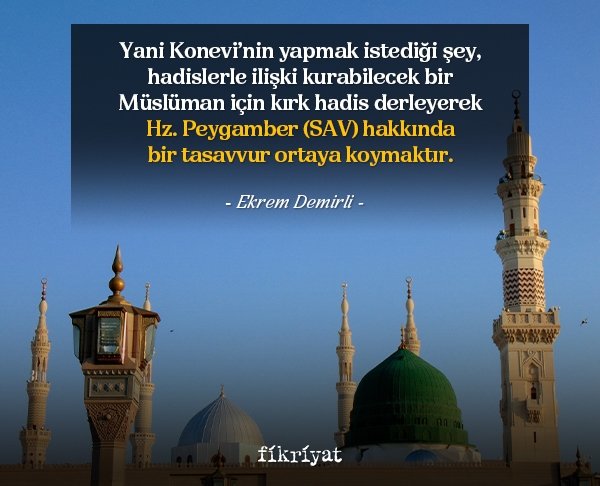 En meşhurlarından bir tanesi de İmam Nevevî'nindir. O kadar olmasa bile meşhur olanlardan bir tanesi ise Sadreddin Konevi'dir. Dolayısıyla yani Konevi'nin yapmak istediği şey, hadislerle ilişki kurabilecek bir Müslüman için kırk hadis derleyerek Hz. Peygamber (SAV) hakkında bir tasavvur ortaya koymaktır. Yani Peygamber Efendimiz (SAV) ne dedi? Madem nübüvvetin kaynağı o, kaynak bize ne dedi? Aslında Sadreddin Konevi'nin Kırk Hadis Şerhi'ni düşünürken Fatiha Tefsiri'ni yorumlamasını dikkate almak lazım. Dikkat ederseniz Fatiha Tefsiri'nin Kur'an-ı Kerim ile ilişkisiyle kırk hadis litaretürünün hadis koleksiyonlarla ilişkisi aynıdır. Fatiha Tefsiri esas itibariyle Kur'an-ı Kerim'in bir hülasası gibi kabul edilir.