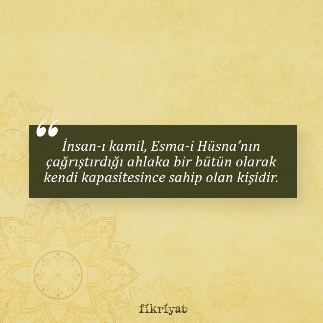💠 Bu aslında insanın ahlakı açısından da çok önemli bir meseledir. İnsanın ahlakında da bir taraf eksik olduğunda diğerleri de işlevini yitirir. İnsan-ı Kamil bu isimlerin çağrıştırdığı ahlaka bir bütün olarak kendi kapasitesince sahip olan kişidir.