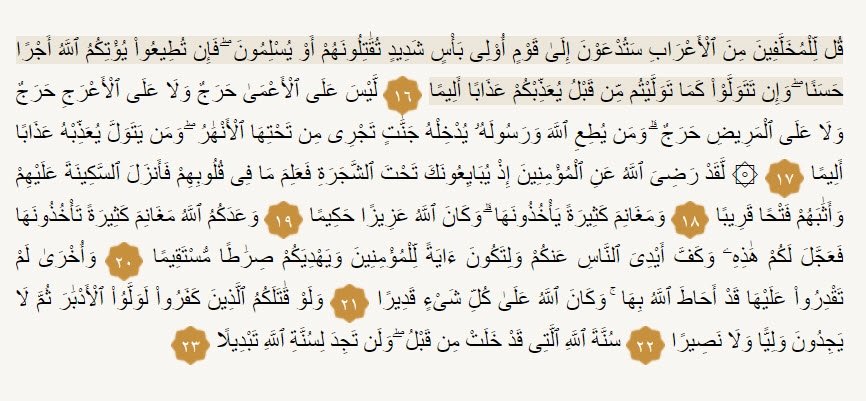 16. Kul lil muhallefîne minel a'râbi se tud'avne ilâ kavmin ulî be'sin şedîdin tukâtilûnehum ev yuslimûn(yuslimûne), fe in tutîû yu'tikumullâhu ecran hasenâ(hasenen), ve in tetevellev kemâ tevelleytum min kablu yuazzibkum azâben elîmâ.