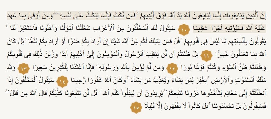 10. İnnellezîne yubâyiûneke innemâ yubâyiûnallâh(yubâyiûnallâhe), yedullâhi fevka eydîhim, fe men nekese fe innemâ yenkusu alâ nefsihî, ve men evfâ bi mâ âhede aleyhullâhe fe se yu'tîhi ecran azîmâ.
