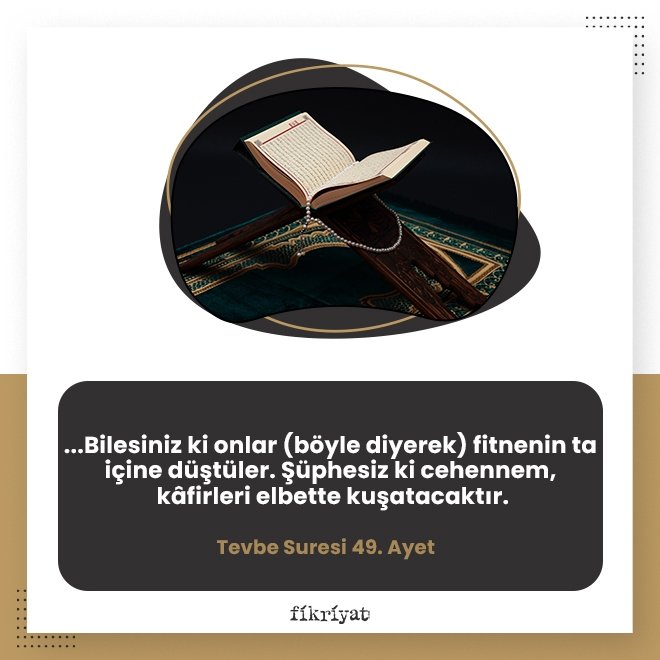 "Onlardan "Bana izin ver, beni fitneye (isyana) sevk etme" diyen de vardır. Bilesiniz ki onlar (böyle diyerek) fitnenin ta içine düştüler. Şüphesiz ki cehennem, kâfirleri elbette kuşatacaktır." (Tevbe Suresi, 49. ayet)