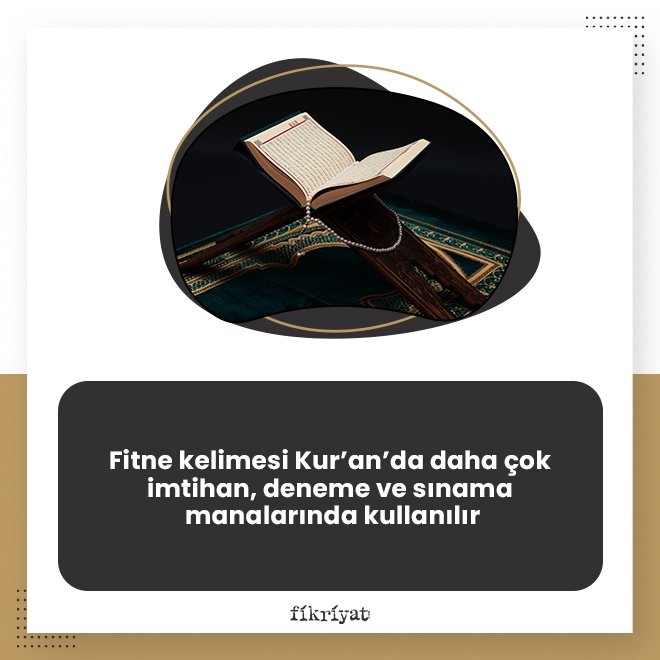 🔸 Genel itibari ile fitne imtihan, iyi veya kötü şeylerle deneme, manevi çöküntü, dini, içtimai ve siyasi kargaşa gibi oldukça geniş kapsamlı anlamlarda kullanılır. Fitne kelimesi, Kur'an'da daha çok imtihan, deneme ve sınama manalarıyla karşımıza çıkar.